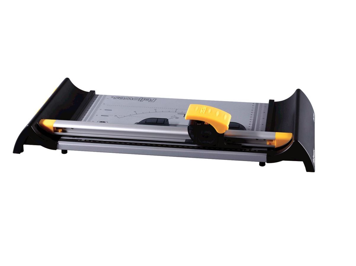 - Має безпечні для використання касети Fellowes SafeCut™ з лезами із нержавіючої сталі, леза весь час перебувають в кожусі касети і висуваються лише під час різання