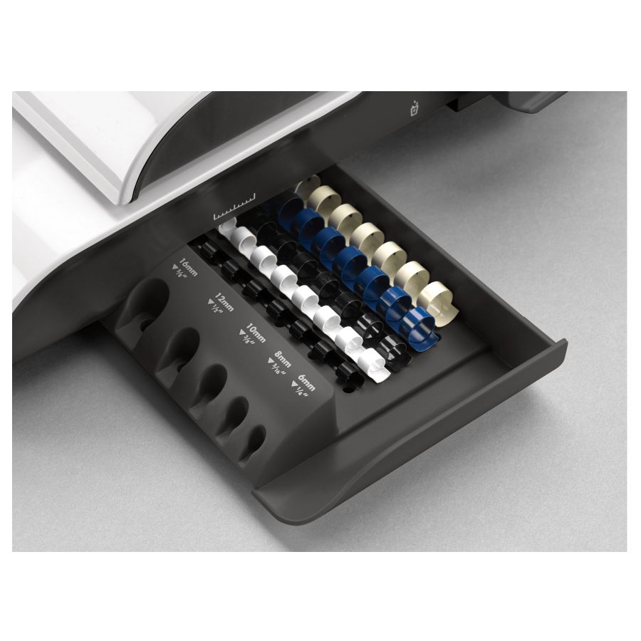 - Ергономічний. Спеціальна окрема шухляда для зберігання корінців з запатентованою системою вимірювання товщини документів та підбору відповідного корінця.