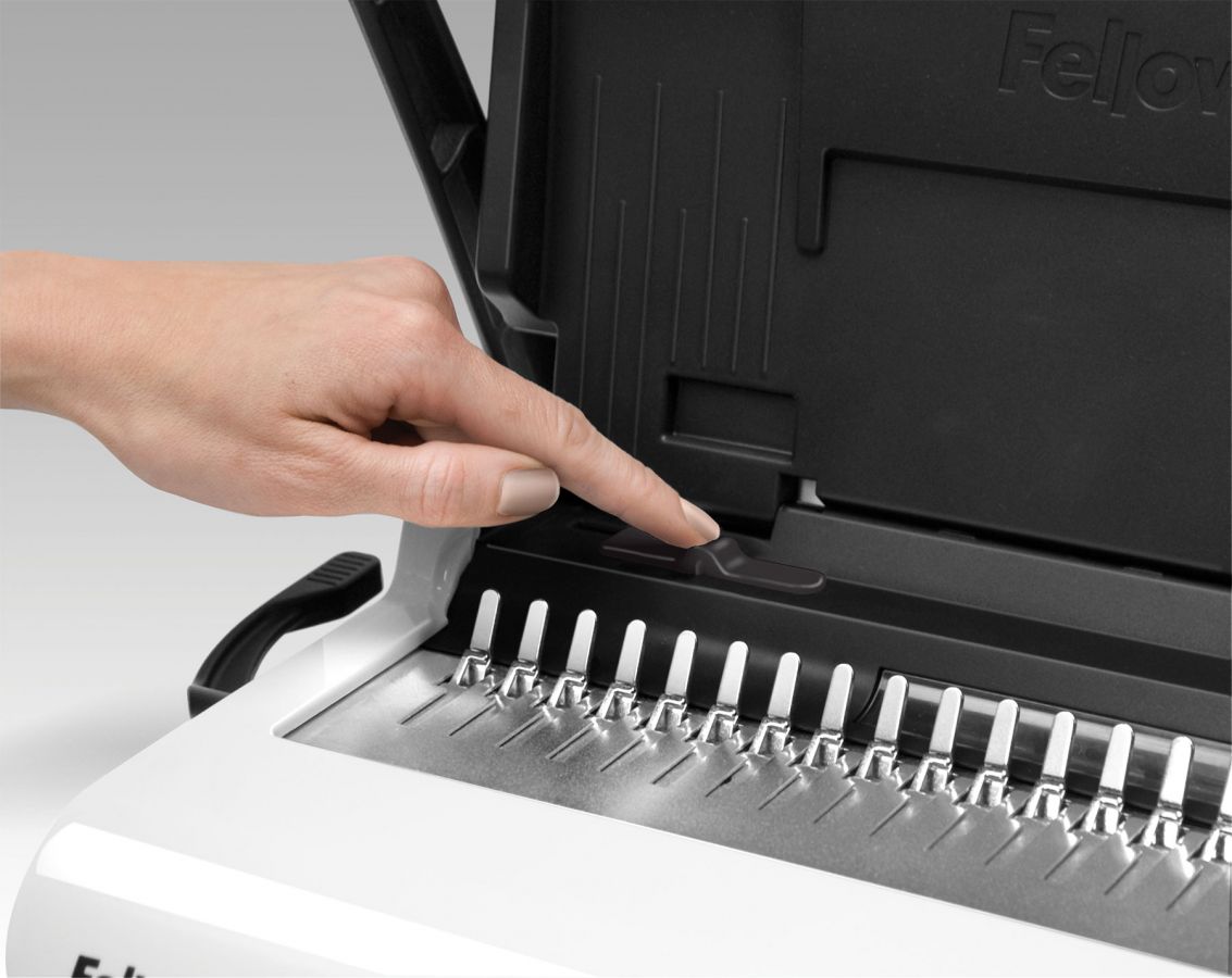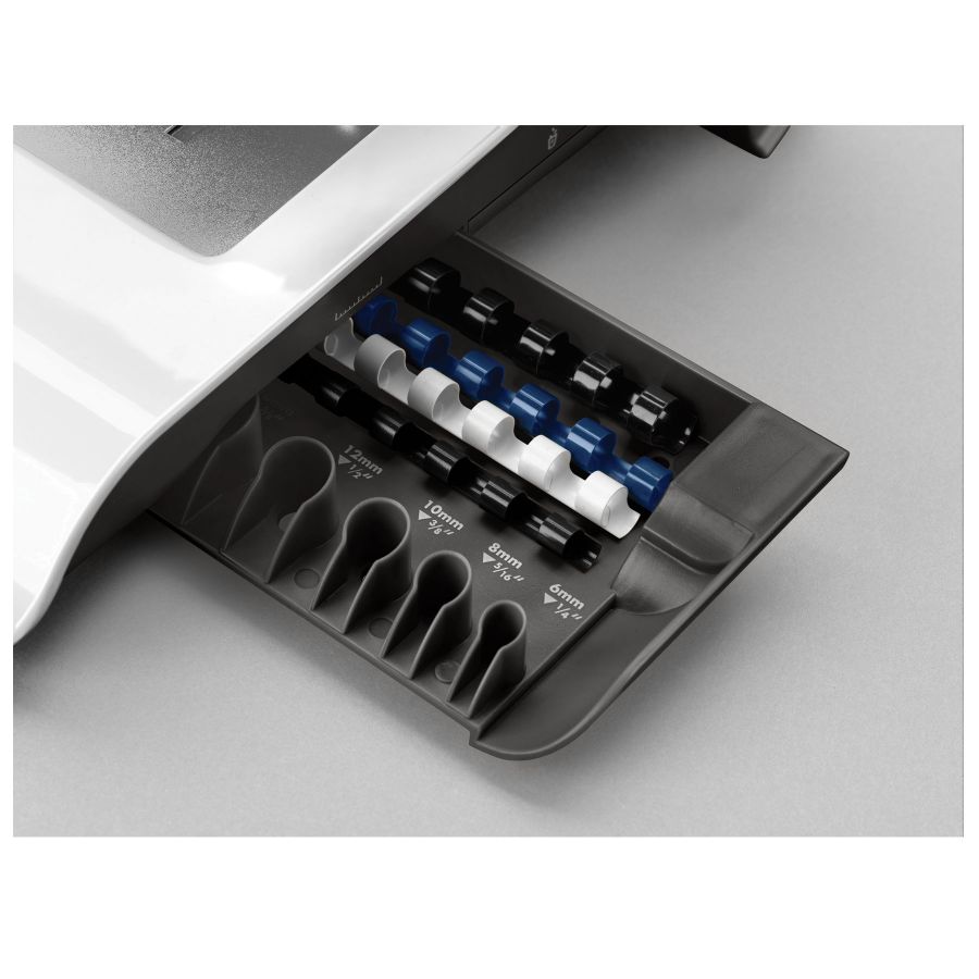 - Ергономічний. Спеціальна окрема шухляда для зберігання корінців з запатентованою системою вимірювання товщини документів та підбору відповідного корінця.