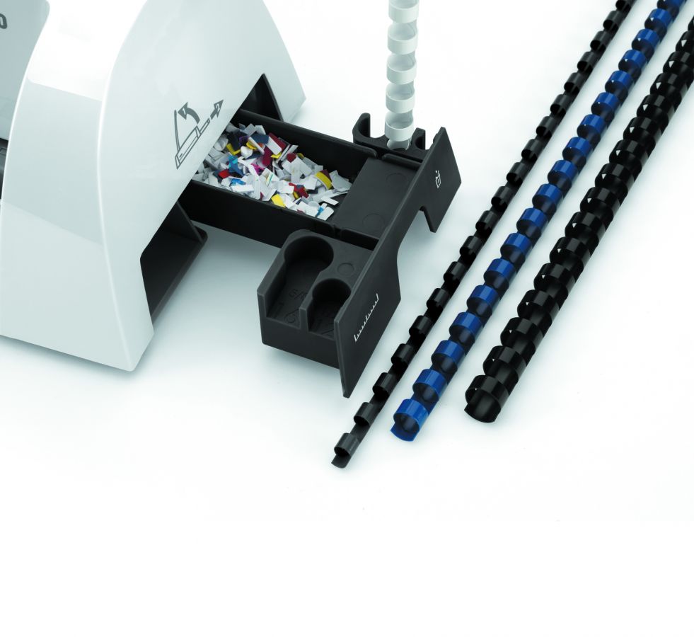 • Ергономічний. Спеціальна шухляда для зберігання корінців з запатентованою системою вимірювання товщини документів та підбору відповідного корінця.